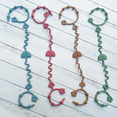 Nuestras cuerdas de silicona son un MUST! Un infaltables para tus paseos o para el momento que necesites, mantendrán los accesorios y Jugueteria de tu bebé donde deben estar, sin el riesgo de perderse.