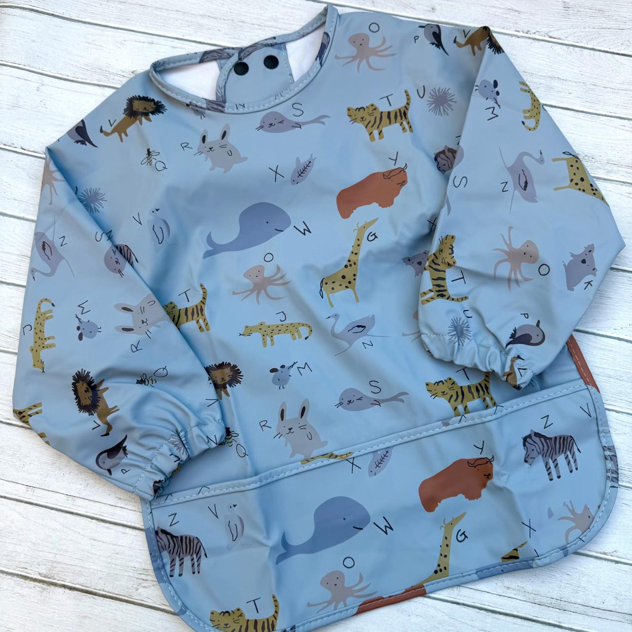 Fabricada en poliéster reciclado impermeable, es ligera, práctica y fácil de limpiar. Perfecta para la hora de comer, pintar o jugar sin preocupaciones. 🌱💧