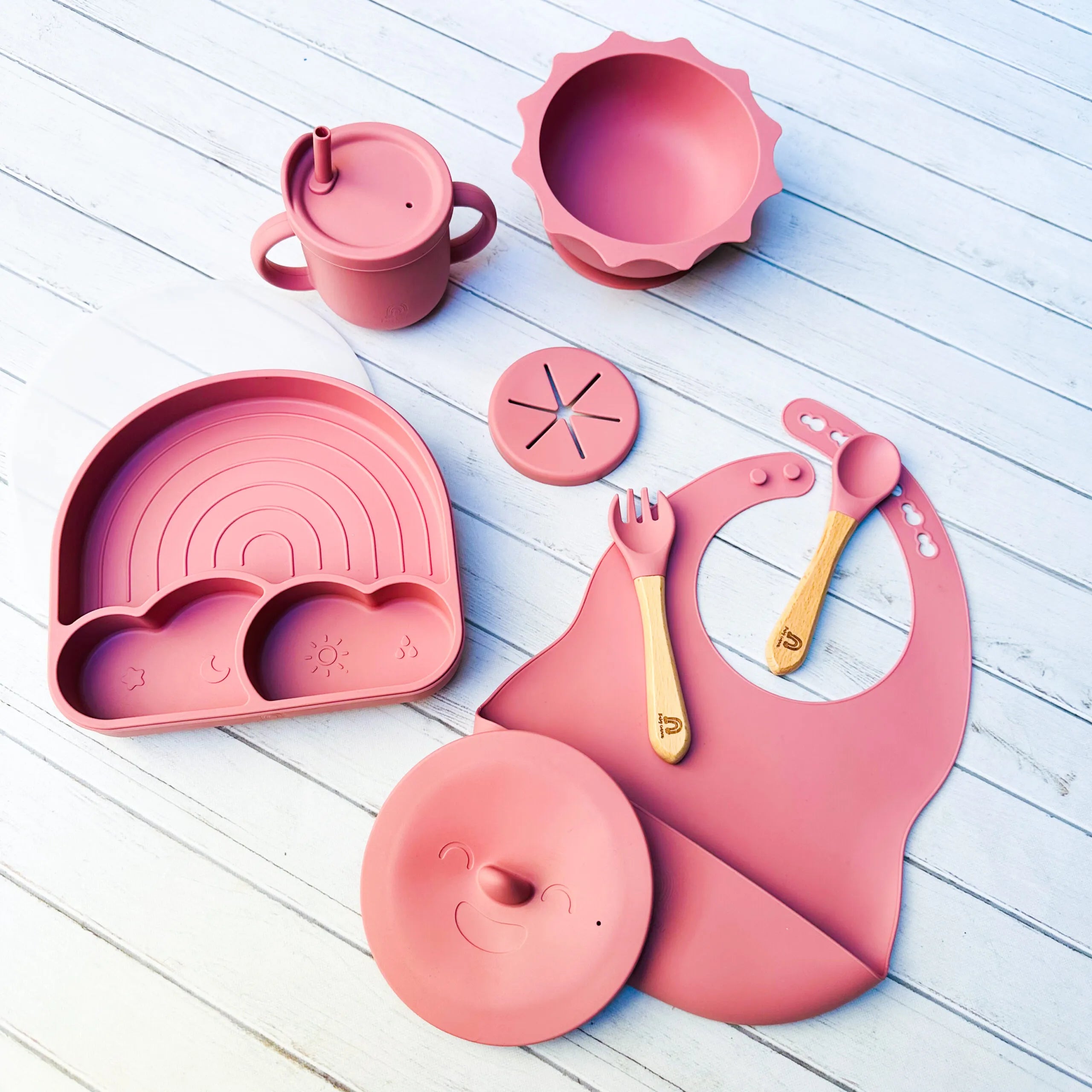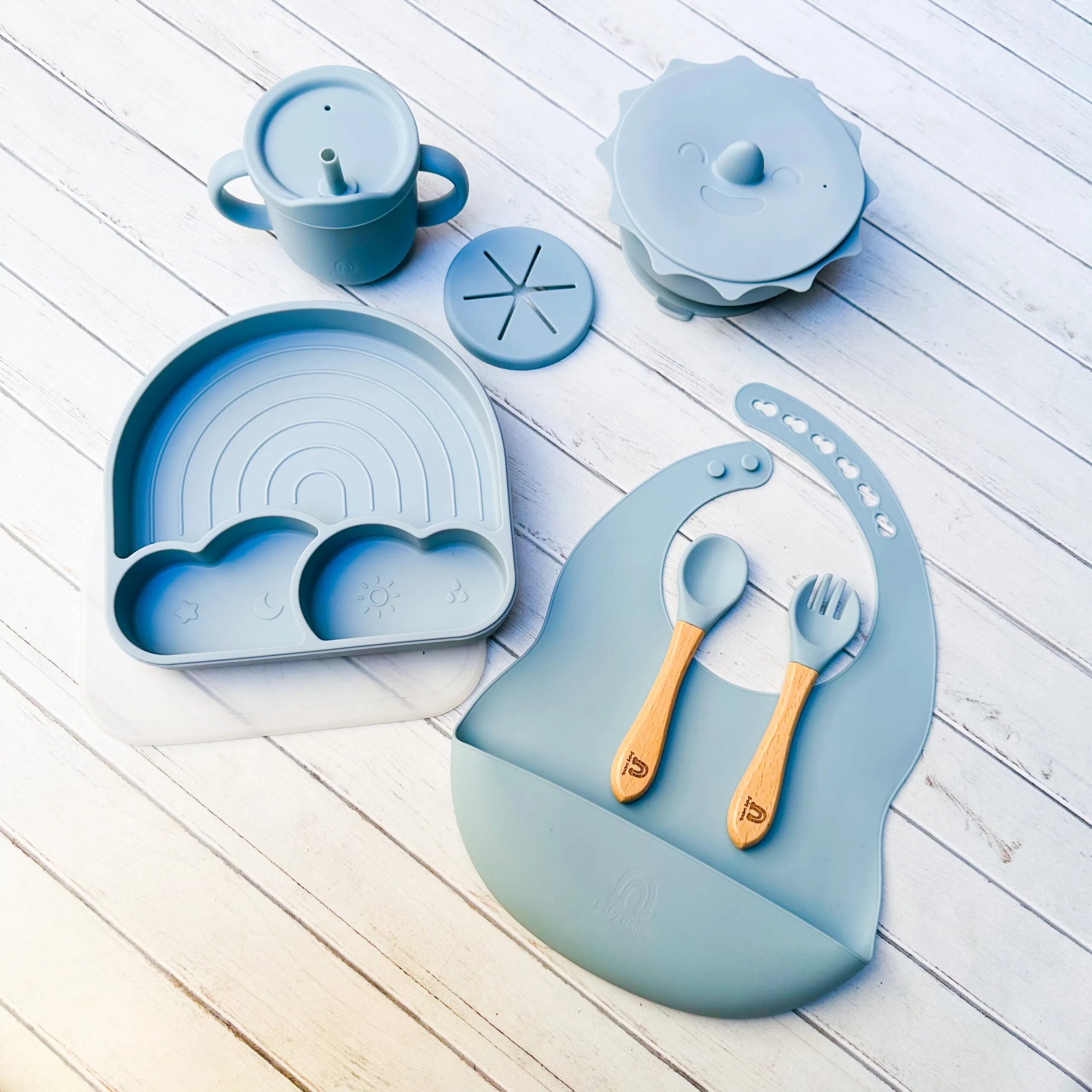 Este set es hermoso y destaca por su practicidad: tanto el bowl como el platito incluyen una tapita de silicona, ideal para guardar la comida de tu peque o llevarla a donde quieras de forma segura y cómoda. 🌈